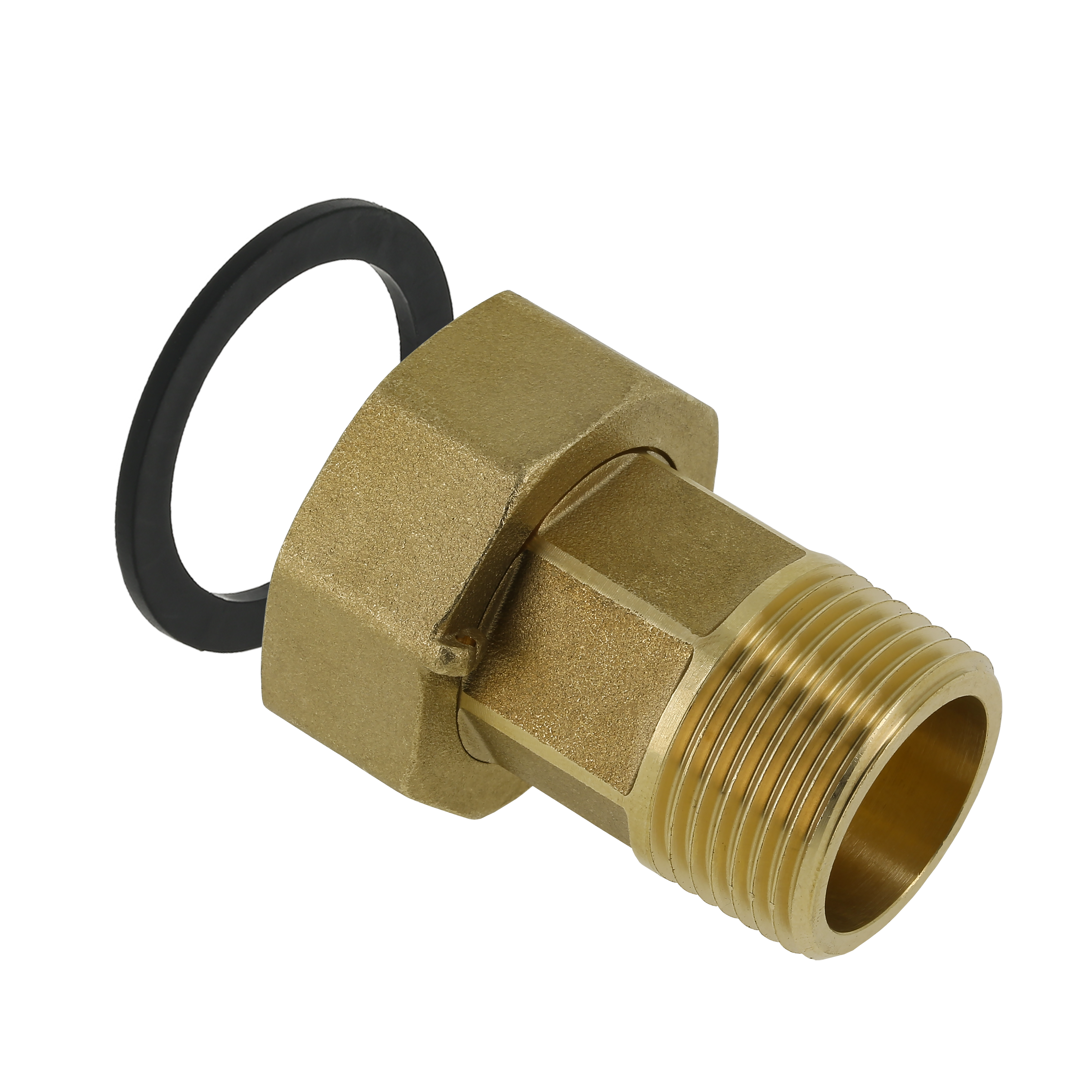 2-delige rechte koppeling. Met vlakke dichting voor water conische buitendraad x wartelmoer.