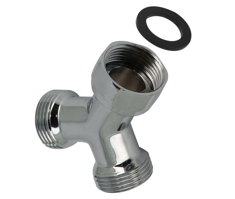 Y-stuk. Buitendraad x swifel-moer x buitendraad.