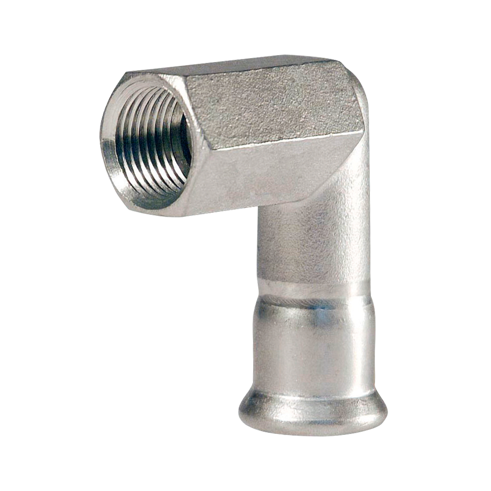 Kniekoppeling 90°. Lange binnendraad (RP) x press (m-profiel).