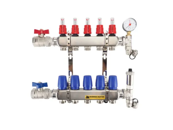 De MAGNUM Premium RVS verdeler wordt toegepast in laag temperatuur installaties en is vervaardigd van het zeer hoogwaardig RVS 4301. Standaard is deze verdeler voorzien van 1€ Kogelkranen, 2 automatische ontluchters en 2 vulaftapkranen.