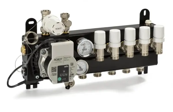 De Robot Standaard PRO verdeler is volledig in eigen huis ontwikkeld. Het resultaat van 30 jaar ervaring biedt een doordachte combinatie van optimale functionaliteit met eenvoudige installatie. De verdeler is dan ook robuuster, compacter en standaard voorzien van een LTV-inregelventiel. En dankzij de 4 nieuwe robuuste ophangbeugels, is de verdeler in alle gevallen makkelijk en altijd passend te monteren. Bovendien is de verdeler geschikt voor verwarmen met CV-ketel en warmtepomp en leverbaar t/m 16 groepen.