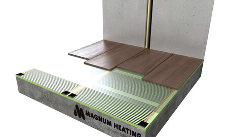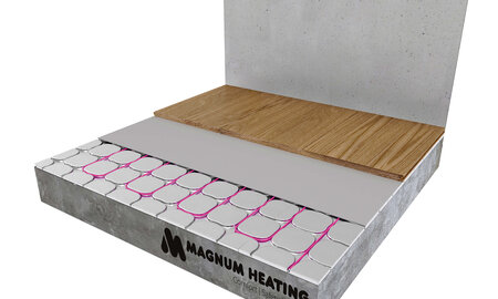 De MAGNUM verwarmingsmat is een unieke vloerverwarmingsmat die speciaal is ontwikkeld om over een bestaande tegelvloer of reeds aangebrachte afwerkvloer vloerverwarming te installeren. Daarnaast heeft deze vloerverwarmingsmat een unieke blinde verbinding tussen verwarmings- en aasluitkabel. De vloerverwarmingsmat is ongeveer 4 mm dun en kan in de lijmlaag worden meegenomen, waardoor deze eenvoudig op tegels kan worden aangebracht. Met de MAGNUM mat wordt uw vloer snel opgewarmd omdat de mat vrijwel direct onder het vloeroppervlak ligt.